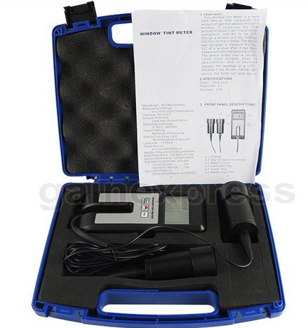 This Window Tint Meter is a hand held device that measures the amount of light that passes through a window. It measures the total amount of Visual Light Transmission (VLT) through a window and any coating (tint film) on that window. This is designed to measure the total VLT of a window after it has been treated with after market window film. The device slides over a partially rolled down window, does its calculations, and in seconds displays the readings on the LCD. Additional features includes continous measuring mode and it has its own internal light source, so the meter will work day or night.