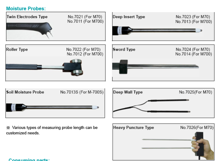 This is a set of moisture sensors for measuring different type of materials.Moisture sensors includes 1 unit of pin-type sensor, 1 unit of roller-type sensor.
