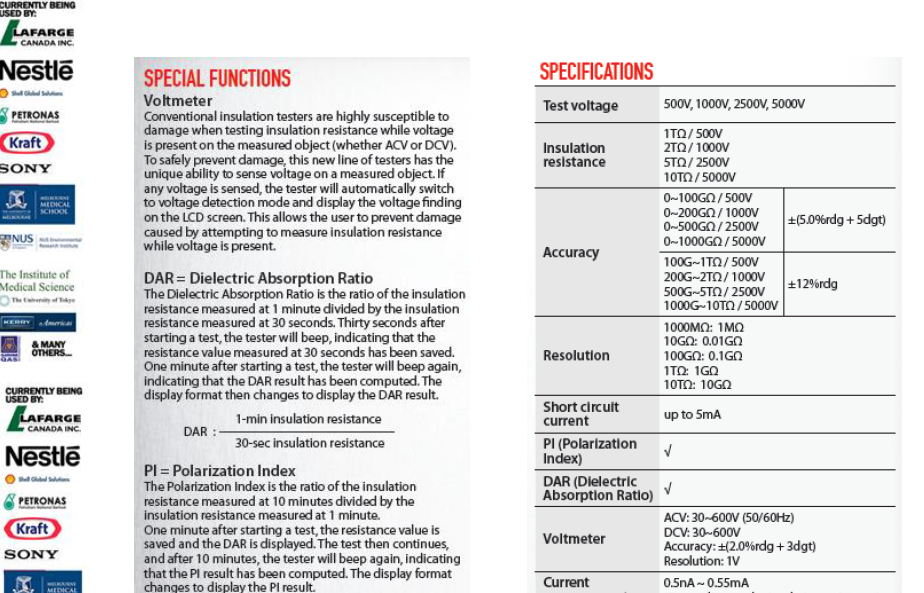 ● 4 Insulation test voltages: 500V, 1000V, 2500V, 5000V