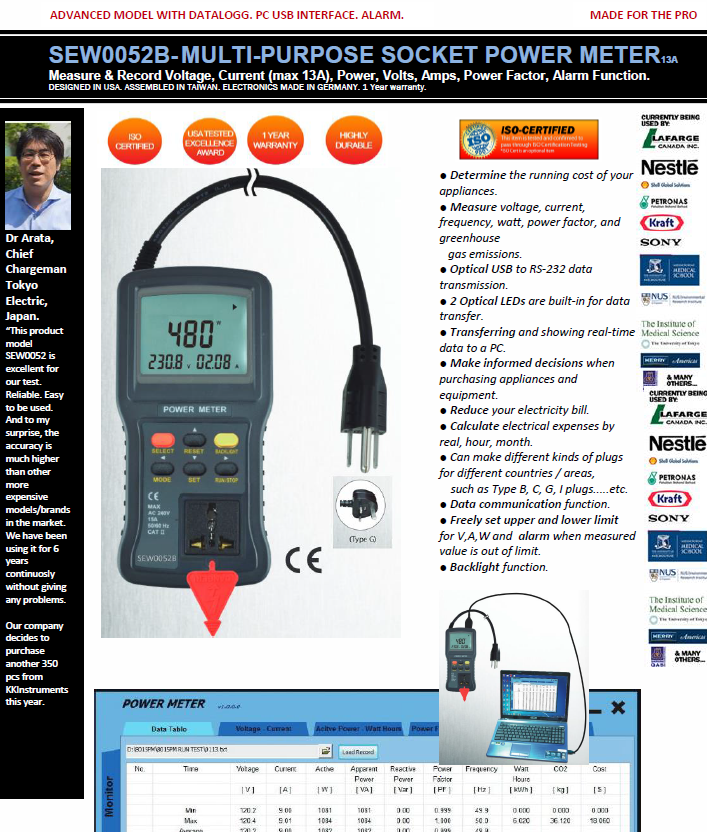 SEW0052B DATALOGGING HEAVY DUTY MULTI-PURPOSE SOCKET ALARM POWER METER (MAX 13A)-230V UK with Alarm/Windows Software(voltage, current, frequency, watt, power factor)