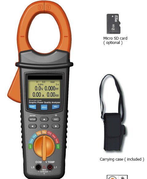 The clamp power analyser  is a very economical solution for the analysis of single phase or balanced 3 phase systems with voltages to 600VAC and current to 2000 amps. The product is related to the Lutron DW 6095 series 3 phase power analysers and uses the same SD card logging. Readings are logged from every 2 second to 7200 seconds as instantaneous values. It also captures 3 types of transient events with programmable threshold. The display is graphical dot matrix and has many graphic formats including waveform on voltage and current - phasor diagram and others.